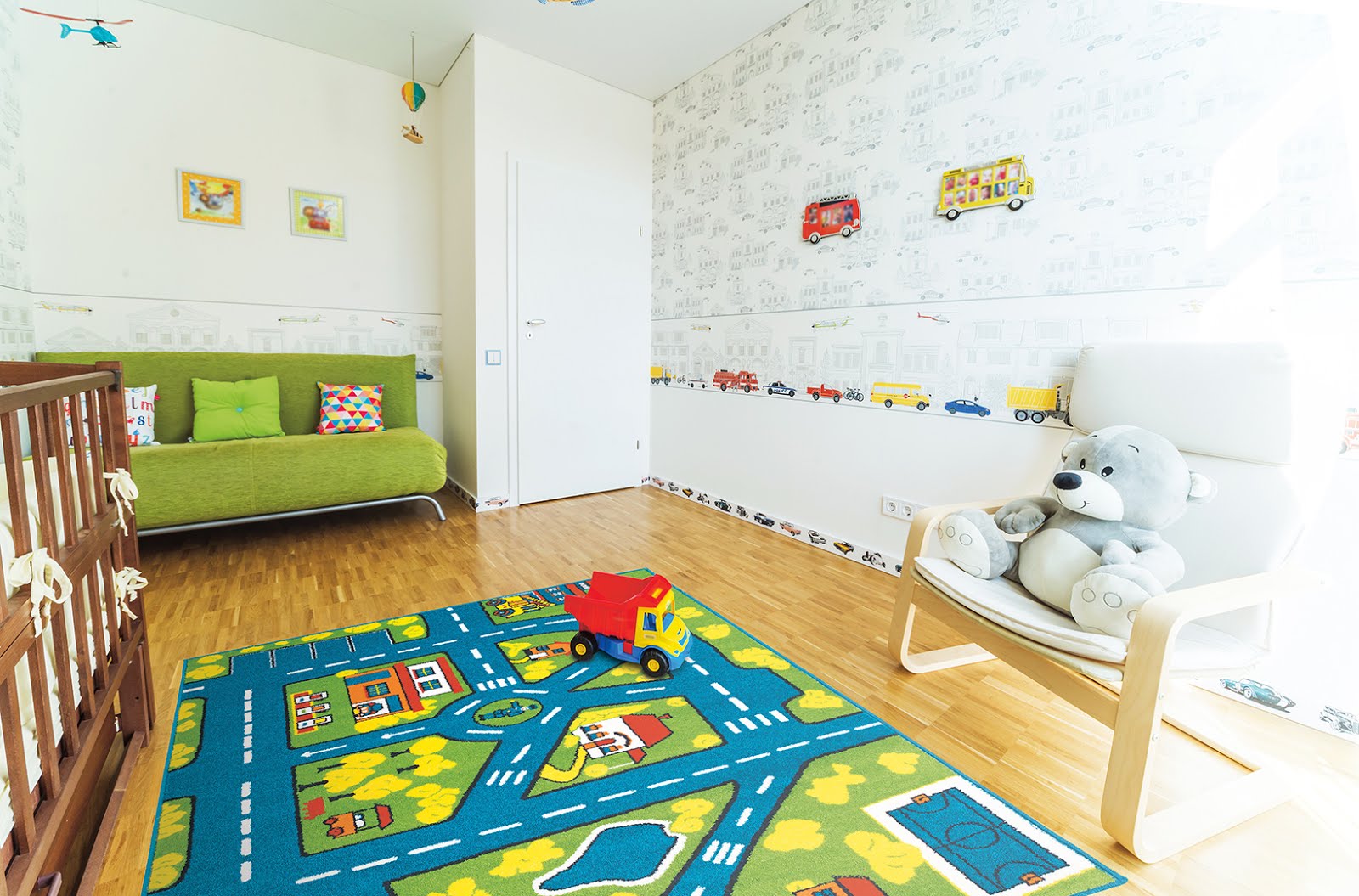 Băieţii vor covor cu străduţe pentru a se putea juca în voie cu maşinuţele.Şi să nu uit de tapetul, tot cu maşinute, evident!