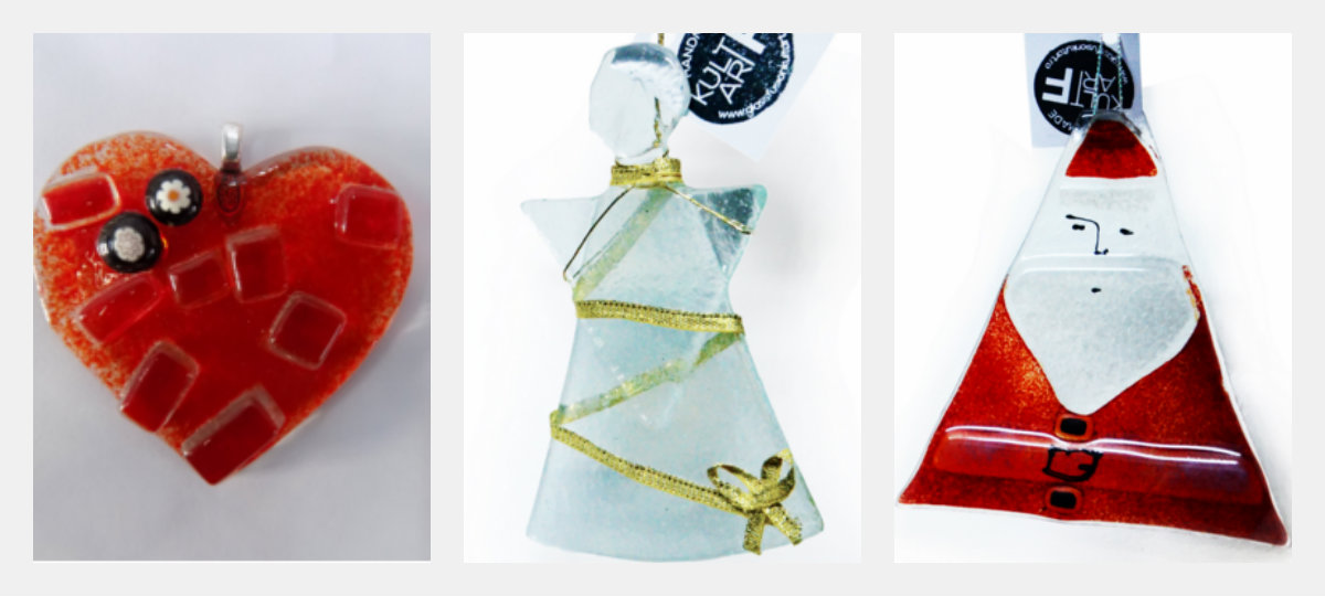 Originalitatea şi creativitatea se regăsesc în obiecte inedite cum ar fi decoraţiunile de iarnă cu Moş Crăciun, fulgi de nea sau îngeraşi din sticlă fuzionată.