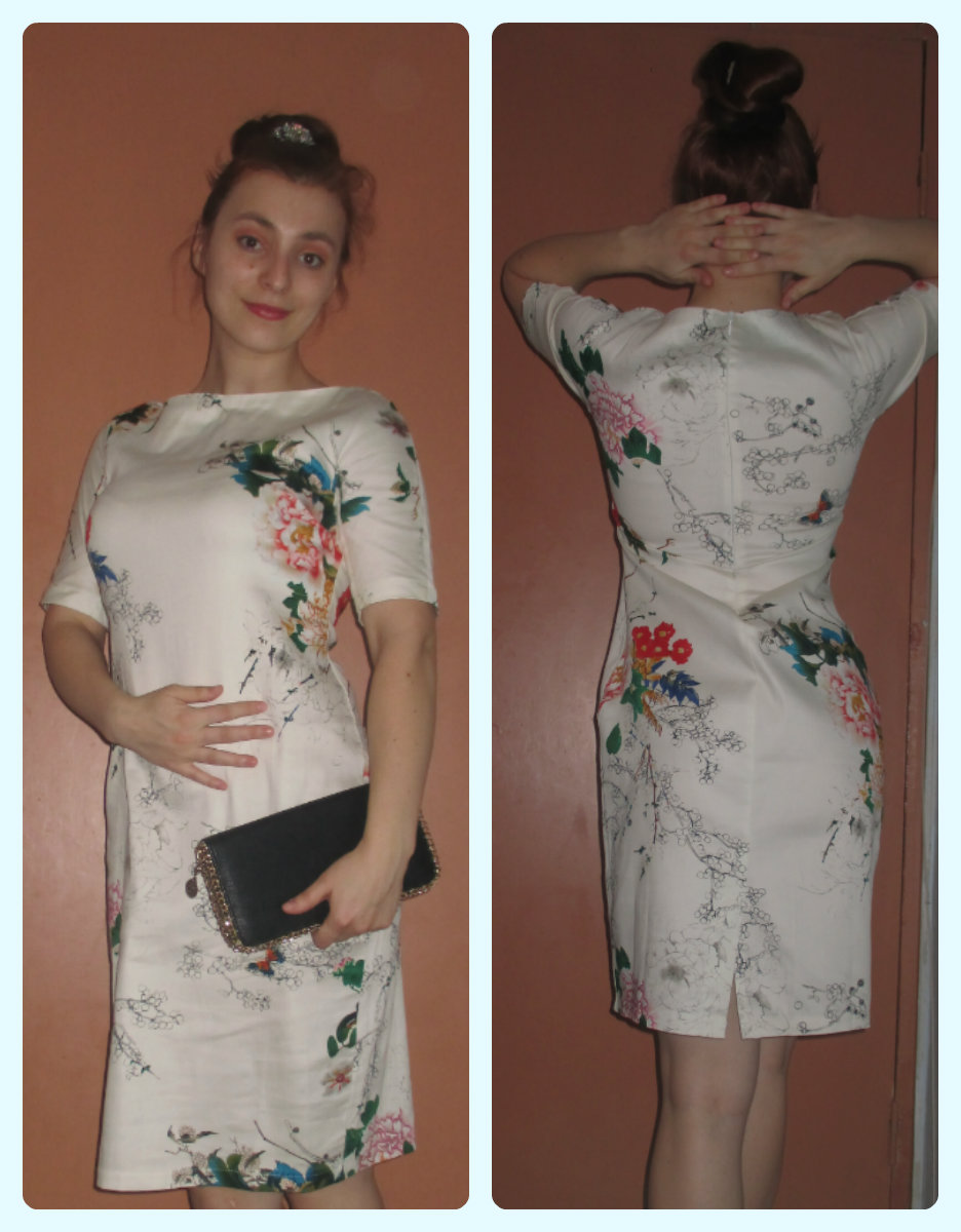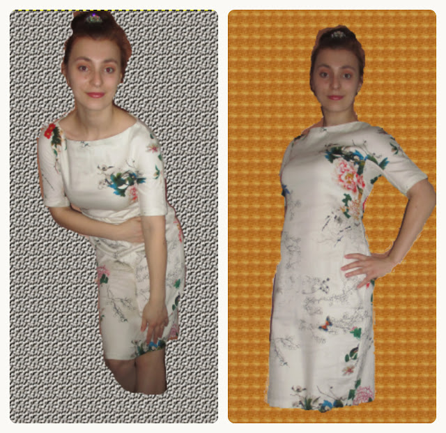 Este vorba de o rochiţă crem cu model floral, de lungime medie şi croială pe talie.